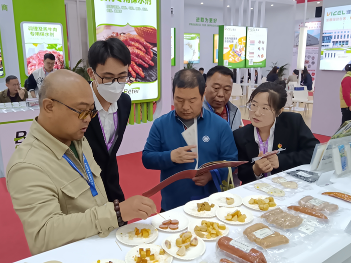 同時,研發(fā)與營銷工作人員熱情接待前來品嘗交流的行業(yè)客戶,詳細介紹海藻膳纖功能配料其應用原理及賦能肉制品的各種可能。