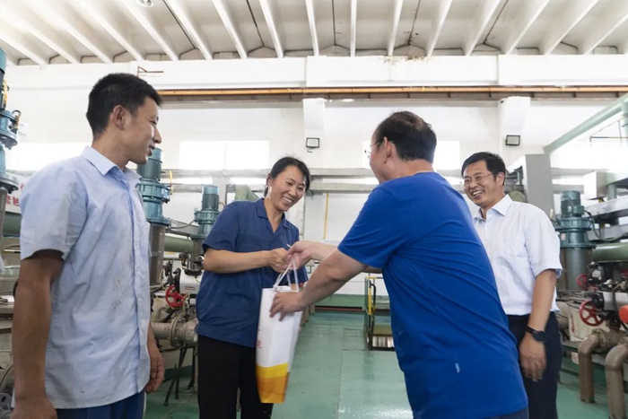 在慰問(wèn)過(guò)程中,朱長(zhǎng)濤首先了解了集團(tuán)在高溫作業(yè)和高溫天氣作業(yè)勞動(dòng)保護(hù)工作的開(kāi)展情況,并深入生產(chǎn)一線將“清涼”送到職工手中。